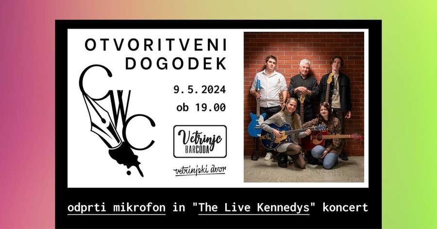 Končno! Z velikim veseljem napovedujemo otvoritveni dogodek, ki bo 9. maja 2024 ob 19. uri v Vetrinjskem dvoru v Mariboru (Vetrinjska ulica 30). Začeli bomo s kratko predstavitvijo našega novo-ustanovljenega centra za kreativno pisanje, sledil bo odprti mikrofon branja poezije in kratke proze. Večer bomo zaključili s koncertom (priložnosti primerno) skupine The Live Kennedys. Pridite in nas pozdravite; če ste dovolj pogumni, prinesite zaprašene papirje s svojim pisanjem za odprti mikrofon, če