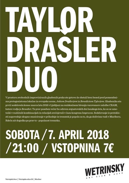 V prostoru svobodnih improviziranih glasbenih praks ste gotovo že obstali brez besed pred pomembnima protagonistoma lokalne in evropske scene, Joštom Drašlerjem in Benedictom Taylorjem. Glasbenika sta prvič sodelovala konec marca leta 2016 v Ljubljani na rezidenčnem bivanju varovancev založbe CRAM, katere vodja je Benedict. Ta prav poseben večer bo odzven avgustovskih dni lanskega leta, ko so se umetniki v različnih kombinacijah in relacijah srečevali v času kongresa Improcon. Sodelovanje iz