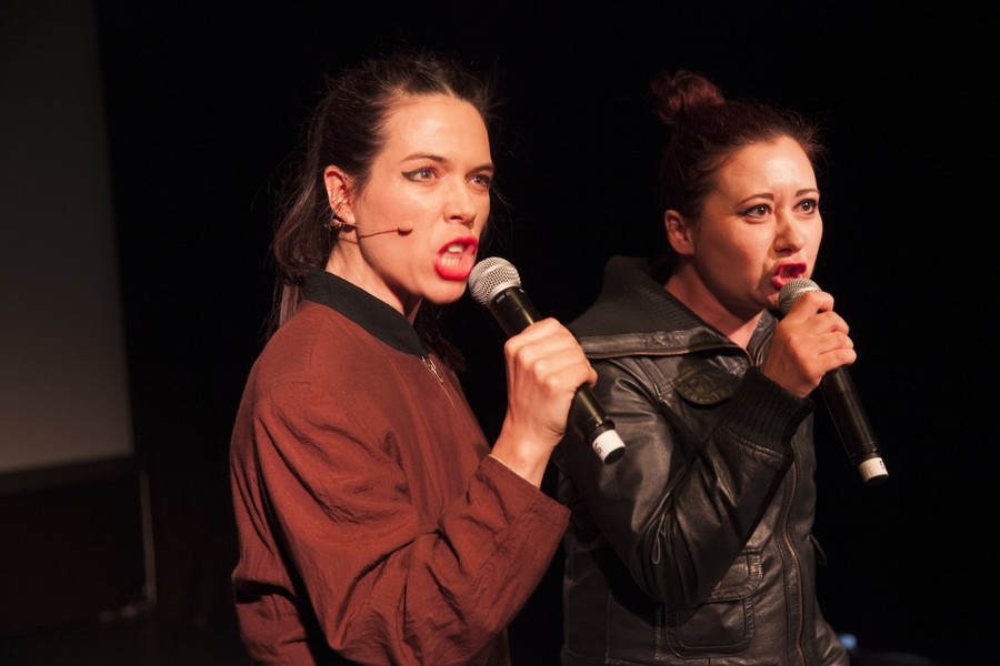 Performerki v čudaškem prepletu hip hopa, performansa in Handkejevega konfrontacijskega gledališča iz šestdesetih let zavzameta fiktivni položaj moči v odnosu do občinstva in z rimano refleksijo o razlogih za verbalni delikt in užitku v njem močno načneta oziroma predreta "četrto steno".