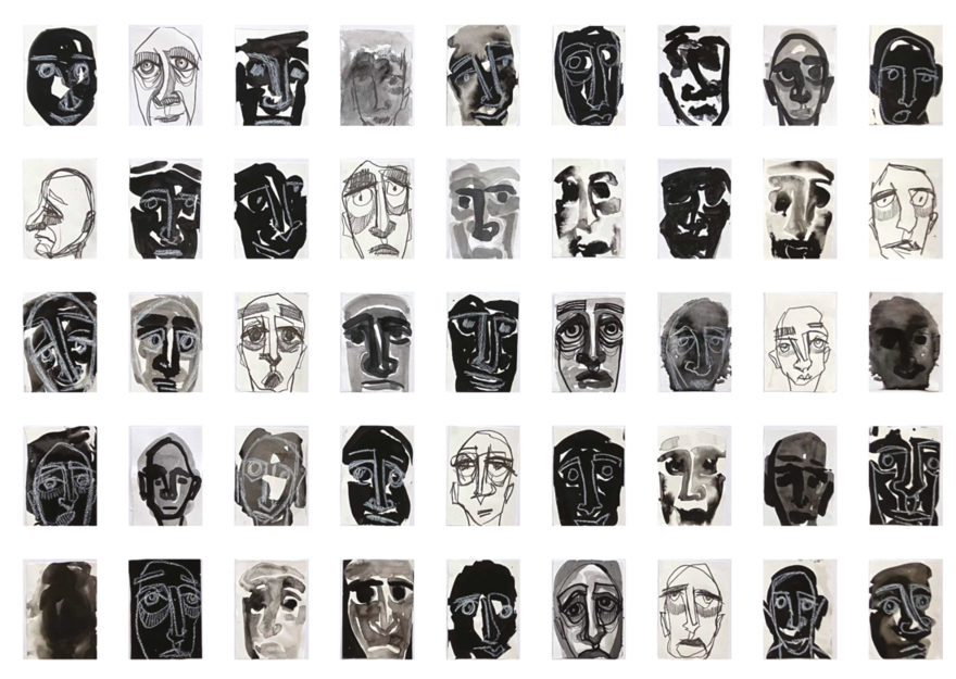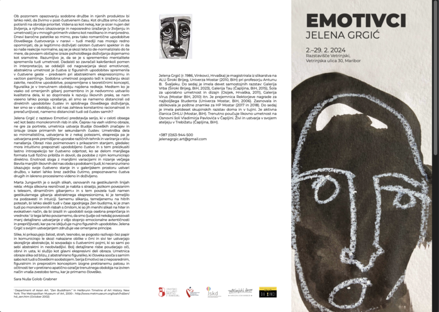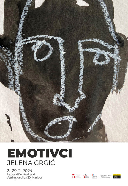 Jelena Grgić z razstavo Emotivci predstavlja serijo, ki v celoti obsega več kot šesto monokromnih risb in slik. Čeprav na vseh vidimo obraze, ne gre za portrete, umetnica ustvarja študije človeških značajev in izrisuje izraze primarnih ter sekundarnih čustev. Umetniška dela so minimalistična, ustvarjena le z nekaj potezami, ekspresija pa je ustvarjena prek premišljene uporabe različnih tehnik in variiranja v stilu nanašanja. Obrazi niso poimenovani s prikazanim stanjem, gledalec mora intuitivno prepoznati upodobljeno čustvo in s tem preizkusiti lastno introspekcijo ter čustveno odprtost, ko se delom manjšega formata tudi fizično približa in dovoli, da podobe z njim komunicirajo direktno. Enotnost sloga z manjšimi variacijami in nizanje večjega števila manjših likovnih del nas obda s podobami ljudi, ki necenzurirano izkazujejo svoje čustveno stanje in v galerijskem prostoru ustvari družbo, v kateri lahko brez zadržka čutimo, prepoznavamo čustva drugih in iskreno procesiramo videno in doživljeno.