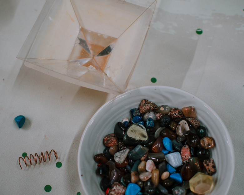 Orgoniti in drugi izdelki iz epoksi smole z mentorsko pomočjo likovne pedagoginje Manje Jerič.