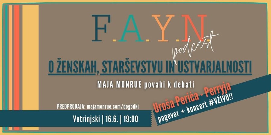 Maja Monrue se vrača s prodornimi debatami o življenju in posebnimi gosti. Tokrat je k pogovoru povabila Uroša Periča – Perryja, vrhunskega glasbenika, najbolj poznanega po neprekosljivi imitaciji Raya Charlesa. Ker je res fayn človek, ker je oče in ker je izjemen ustvarjalec. Govorila bosta namreč o ustvarjalnosti, o starševstvu, kadar je to prepleteno z življenjem umetnika, in moško-ženskih odnosih, SEVEDA. In to še ni vse! Uroš nam bo pripravil tudi