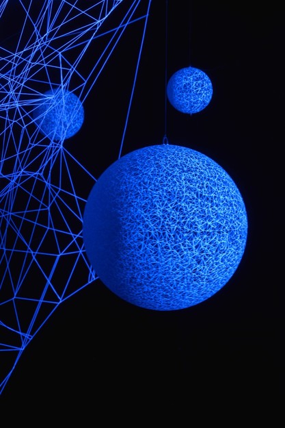 Prostorska postavitev po zamisli umetnic, pod vrhom okrogle strehe Sodnega stolpa, vzpostavlja subtilno območje za čutila. V temnem prostoru odsevajo črtne strukture Nine Šulin in poslikane krogle Natalije R. Črnčec. V modre tone odeta postavitev prepleta umetniške govorice dveh ustvarjalk, ki v sozvočju ustvarjata ločeno, a hkrati nastopata skupaj. Postavitev je v osnovi statična, a postane dinamična tekom premikanja po prostoru. Poglobljeno doživljanje prostora je podprto z avtorsko glasbo JUNEsHELEN, ki krepi občutek breztežnosti.