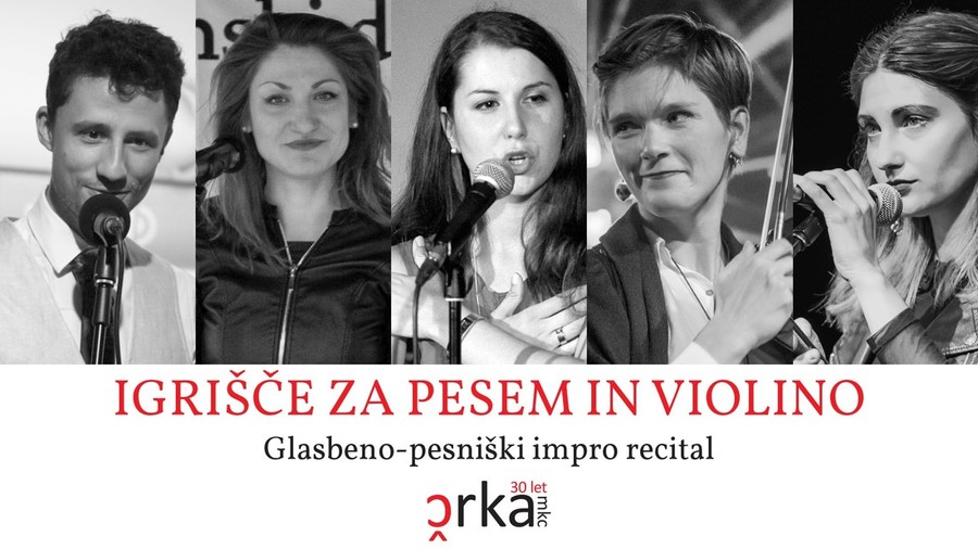 glasbenica / violinistka Špela Huzjak, pesnica Marija Dejanović (Hrvaška) in udeleženci glasbeno-pesniške impro delavnice v organizaciji MKC Črke Nina Medved, Matic Ačko in Kristina Prah.