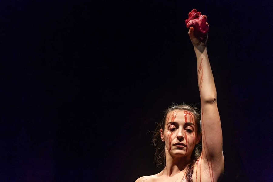KRISTINA ALEKSOVA, SOLO PERFORMANS. SRCE. MIŠICA. ČRPALKA. ORGAN. SIMBOL. METAFORA. HRANA ZA PSE. PERFORMANS, KI SE RAZTEZA IN KRČI.