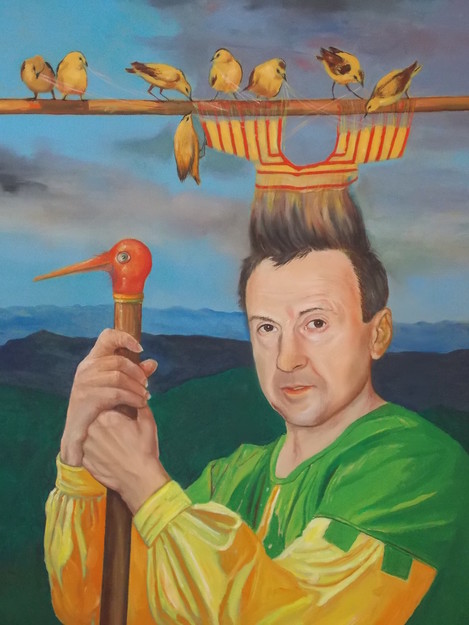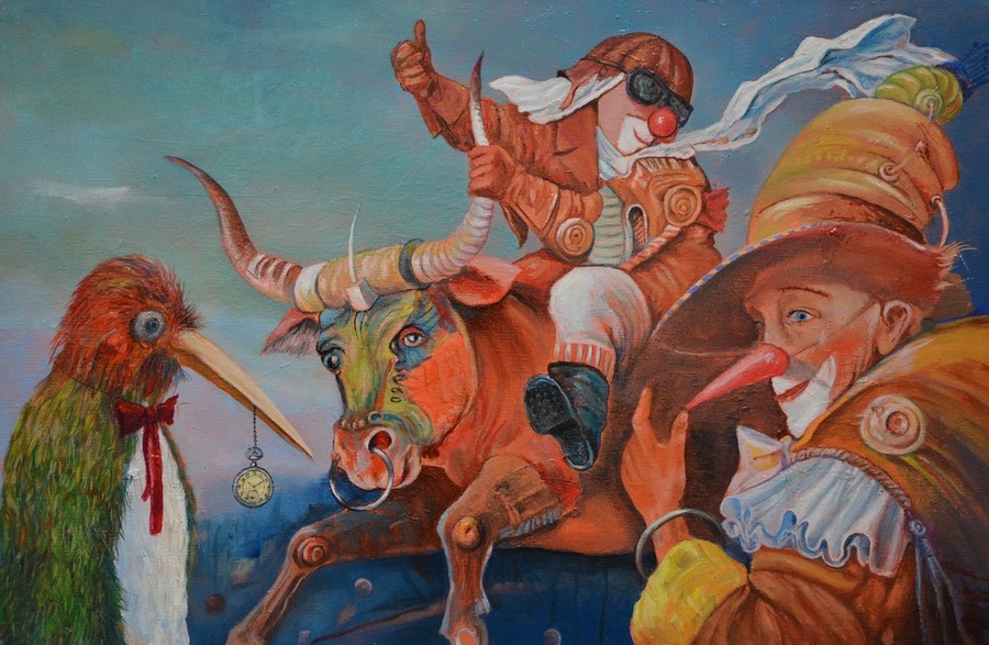 cirkus zamaskiranih klovnov in celo živali (Veseljaki). V takšnem smislu lahko naletimo tudi na umetnikov alter ego, nadnaravno povečan novozelandski kivi s človeškima nogama, imenovan Karibus, asociirajoč na podobno nestvarno bitje Loplop Maxa Ernsta, ki uvaja v likovno dogajanje osebno avtorjevo prisotnost, poleg redkih avtoportretnih upodobitev. Karibusa lahko smatramo tudi kot neke vrste gledališko preobleko (Moj kostim), simbolizirajoč transvestijo umetnikovega pogleda na stvarnost,