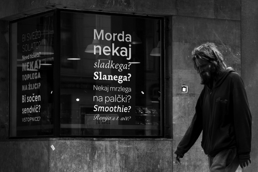 Mnogo prebivalcev večjih mest se je že vsaj enkrat srečalo iz oči v oči z brezdomci, saj jih je težko zgrešiti v osrčju mesta. Natančno število brezdomcev v Sloveniji ni znano, se pa ocene gibljejo med 3.000 in 6.700 osebami brez strehe nad glavo (Statistični urad RS – Surs, 2018). V Mariboru naj bi bilo od 200 do 350 brezdomcev, a v zavetiščih je mest mnogo manj. In mnogi niti ne želijo v zavetišče. Vsako leto 10. oktobra, na svetovni dan brezdomcev, opredelimo definicijo brezdomstva, ki jih je sicer po navedbah Sursa več, pri čemer pa nobena ni napačna. Evropska klasifikacija brezdomstva loči štiri skupine brezdomcev: v prvo uvršča osebe brez strehe nad glavo, v drugo osebe brez stanovanja, v tretjo tiste, ki prebivajo v negotovem, in v četrto tiste, ki prebivajo v neprimernem bivališču. Prvi dve skupini predstavljata vidno (cestno), drugi dve skupini pa skrito brezdomstvo, ki pogosto vodi v vidno brezdomstvo. Vidno brezdomstvo na ulici se – kot kaže tudi ena izmed kompozicijsko uravnoteženih črno-belih fotografij Maje Šivec – očitno kaže tedaj, ko brezdomci s sklonjeno glavo hodijo mimo vabljivih izložb z napisi: Bi sočen sendvič? Morda nekaj sladkega? Slanega? Nekaj toplega na žlici? Brezupno, da zaboli srce.