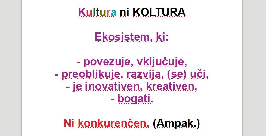 Delamo jo zaradi sebe in za druge. Iz sebičnih razlogov - ker nas bogati in nas dela boljše ljudi. Maribor je RESNIČNA prestolnica kulture, ki v našem mestu nastaja neodvisno od drobiža, kolikor ga za kulturo namenjajo politični odločevalci.