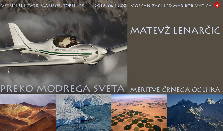 Pilot, fotograf, alpinist, biolog, naravovarstvenik, za nekatere avanturist Matevž Lenarčič je svoja številna zanimanja združil v aktivnost, ki ga zaposluje zadnjih nekaj let. Z ultra lahkim letalom je že trikrat v petih letih preletel svet in ob tem opravil meritve globalnega onesnaževalca, črnega ogljika. Za zloveščim imenom se v resnici skriva nekaj zelo domačega, saje. Te nastajajo pri nepopolnem zgorevanju goriv, ki vsebujejo ogljik. Črni ogljik močno absorbira svetlobo, segreva