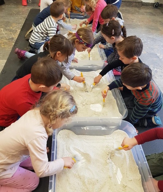 Na muzejnici Mamut otrokom predstavimo življenje v kameni dobi in poklic arheologa. Ob razstavi najstarejšega muzejskega eksponata, okla dlakavega mamuta spoznajo to veliko, danes izumrlo žival. Pogovarjamo se o njegovi velikosti, barvi, dlaki, zobeh in se naučimo kako in zakaj je kamenodobni človek lovil mamuta. Nazadnje v peskovnikih z mivko ponazorimo arheološka izkopavanja, kjer otroci izkopljejo mamutovo okostje in ga sestavijo. Pred odhodom izdelajo tudi ogrlico iz