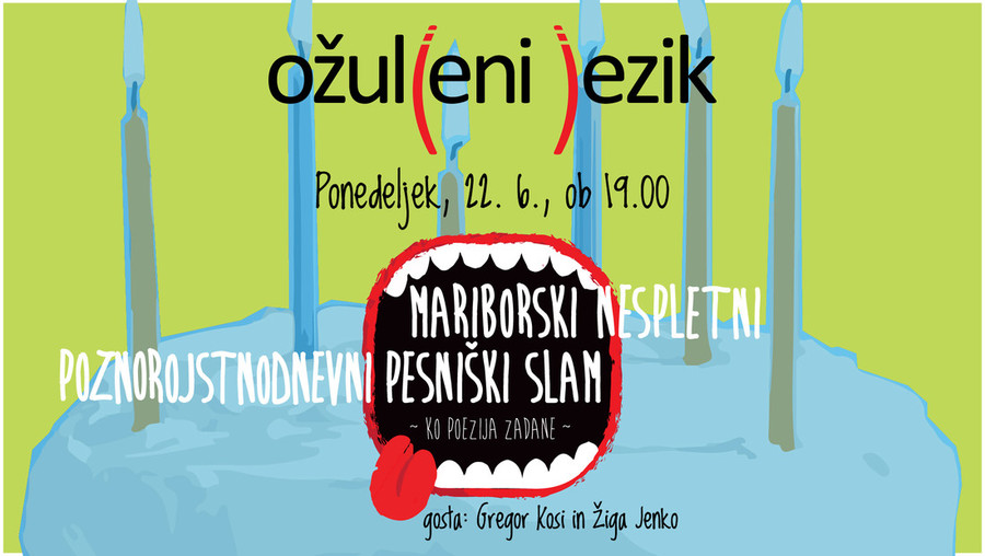 Ker smo bili primorali v mesecu marcu Ožuljeni jezik izjemoma odpovedati, aprila in maja pa smo slam preselili na splet, smo tokrat, ko se lahko kooončno objamemo in V ŽIVO proslavimo rojstni dan, v goste povabili kar dva kulturna ustvarjalca!