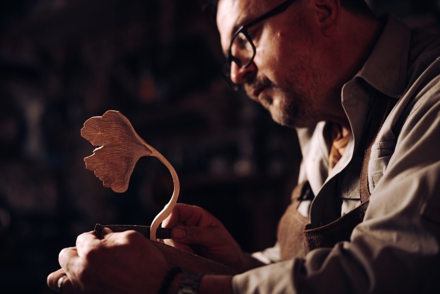Pri delu uporablja različne vrste lesa, večinoma je to les dreves, ki so živela med ljudmi, zato ima prav vsako med njimi svojo zgodbo in v njegovih izdelkih živi naprej.