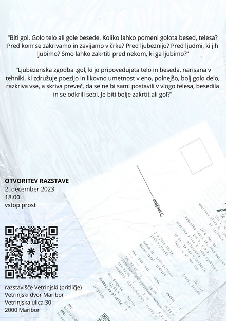 Ljubezenska zgodba .gol, ki jo pripovedujeta telo in beseda, narisana v tehniki, ki združuje poezijo in likovno umetnost v eno, polnejšo, bolj golo delo, razkriva vse, a skriva preveč, da se ne bi sami postavili v vlogo telesa, besedila in se odkrili sebi. Je biti bolje zakrtit ali gol?"