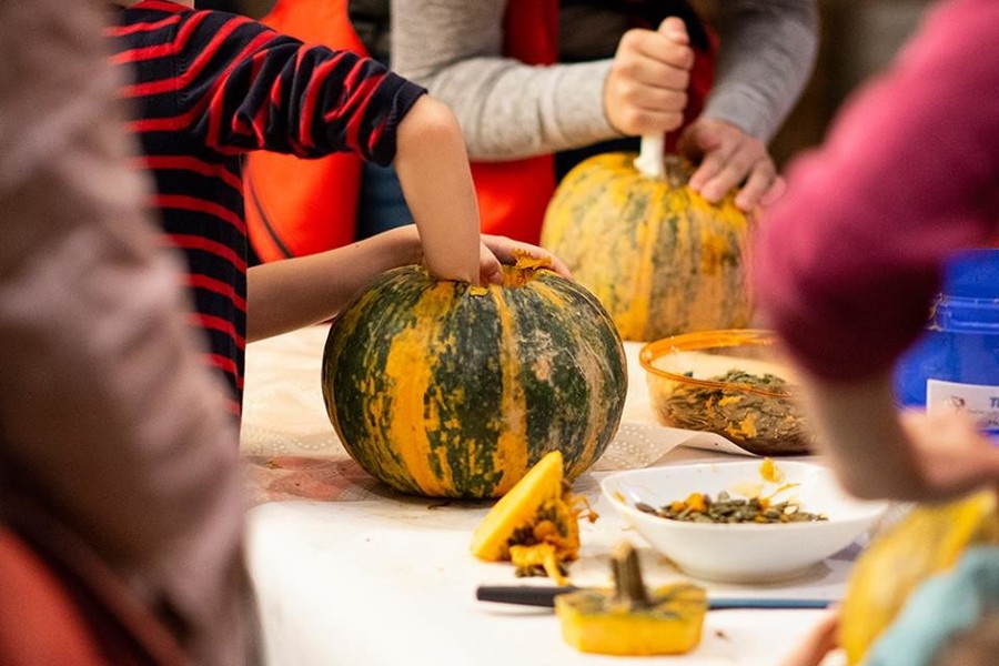 Podobe v bučah – veliko izrezovanje in dolbenje buč (male buče 2 žetončka, velike buče 3 žetončke)