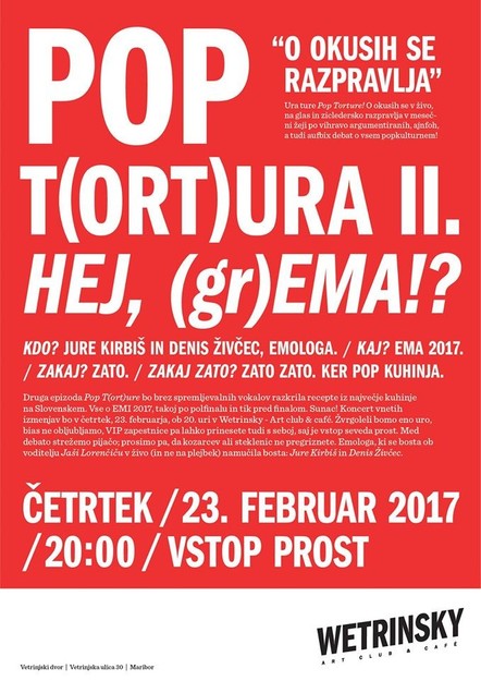 Druga epizoda Pop T(ort)ure bo brez spremljevalnih vokalov razkrila recepte iz največje kuhinje na Slovenskem. Vse o EMI 2017, takoj po polfinalu in tik pred finalom. Sunac! Koncert vnetih izmenjav bo v četrtek, 23. februarja, ob 20. uri v Wetrinsky - Art club & café. Žvrgoleli bomo eno uro, bias ne obljubljamo, VIP zapestnice pa lahko prinesete tudi s seboj, saj je vstop seveda prost. Med debato strežemo pijačo; prosimo pa, da kozarcev ali steklenic ne pregriznete. Emologa, ki se bosta