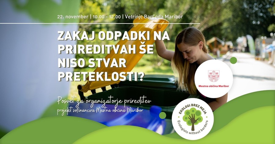 Ekologi brez meja vas v sodelovanju z Mestno občino Maribor vabimo na zaključni posvet projekta Prireditve z manj odpadki. Posvet, ki je namenjen organizatorjem prireditev, odločevalcem, medijem in nevladnim organizacijam, bo potekal v času Evropskega tedna zmanjševanja odpadkov, v sredo, 22. novembra, med 10. in 12. uro v Vetrinjcu BarCoda, Vetrinjska ulica 30, Maribor.