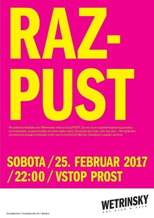 Na sobotno klubsko noč Wetrinsky vabi na (raz)PUST. Za vse, ki se s pustovanjem kaj posebej ne bremenite, se pusta bojite ali samo slabo spite. Druženje kar tako, zato ker pač... Na lahkotno neevforičen hangout klubski večer nas bo bodril DJ Michel. Zaželjeni z masko ali brez.