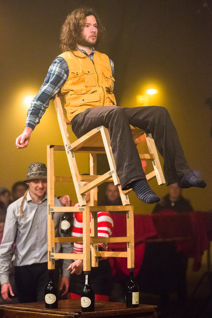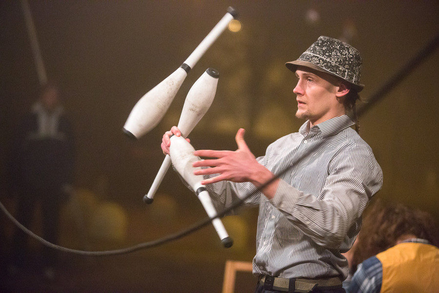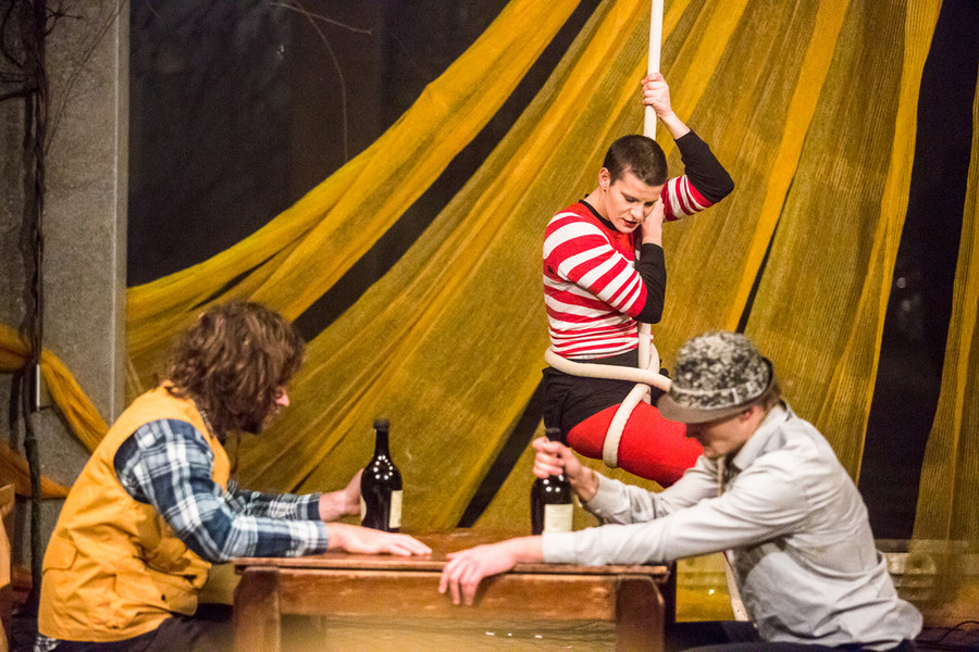 Dve drevesi, dva stola, dve vrvi, v vertikali in horizontali, ter ena tkanina, razklana na dvoje. Trije liki iščejo pot iz nihanja med monotonim vsakdanom ter negotovim jutri. Jim bo uspelo ubežati rutini ali jih bo pot zvlekla v vse večjo norost ponavljajočih se dejanj? Cirkuška predstava z atraktivnimi figurami v zraku, žongliranjem s keglji in lovljenjem ravnotežja na vrvi. Aha, ravnotežje je pomembno!