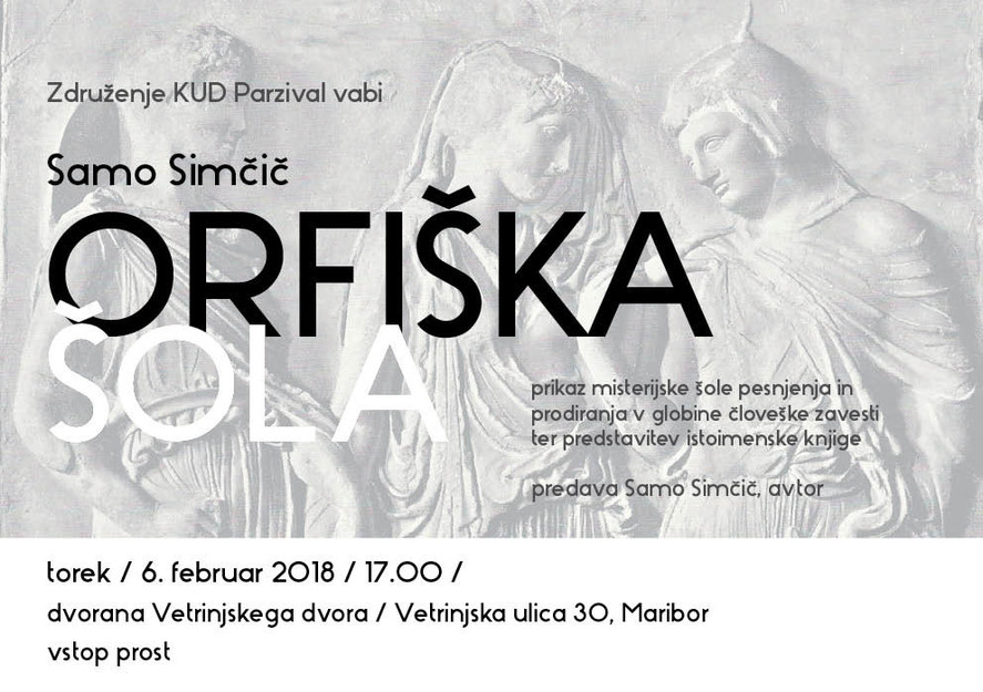 Ker je tako imenovana tajna orfiška šola izšla iz delovanja Apolonovega templja v Delfih, ta pa je s svojim izrekom: "Spoznaj sebe in spoznal boš svet in bogove!" vir starogrške filozofije in evropske kulture, se bo Samo Simčič ob predstavitvi knjige dotaknil tudi dveh tokov evropske zavesti, zahodnega- in srednjeevropskega. Razlika in odnos med obema sta danes takorekoč pozabljena.