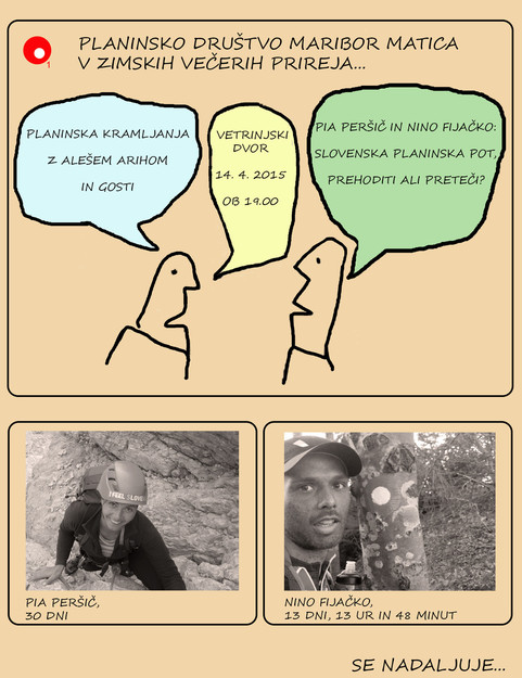 Planinsko društvo Maribor Matica vabi na redna planinska kramljanja; tokrat bo Aleš Arih kramljal s Pio Peršič in Ninom Fijačkom o njunih zgodbah in dogodivščinah na slovenski planinski poti. Pia jo je prehodila v 30 dneh, Nino pa pretekel v 13 dnevih, 13 urah in 48 minutah.... Zakaj in kako?