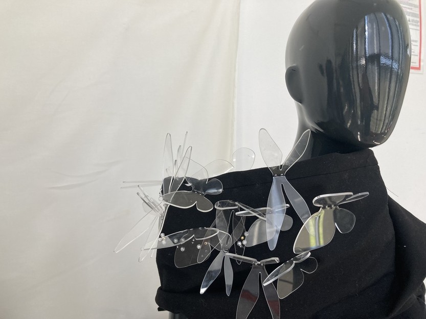 Svoj navdih je našla pri žuželkah, predvsem metuljih in kačjih pastirjih. Izbrala je Laproptero Meges, elegantnega azijskega metulja. Za osnovo je naredila črn bodi, ki je enostaven in eleganten z globokim vratnim izrezom. Nato je izdelala še črne hlače iz bombaža, na katere je pritrdila metulje in kačje pastirje iz pleksistekla v različnih velikostih. Komplet dopolnjuje šal v organski obliki kril. Celotna kreacije je črna, ki so ji dodani prebliski pastelno zelene, modre, rumene in roza.