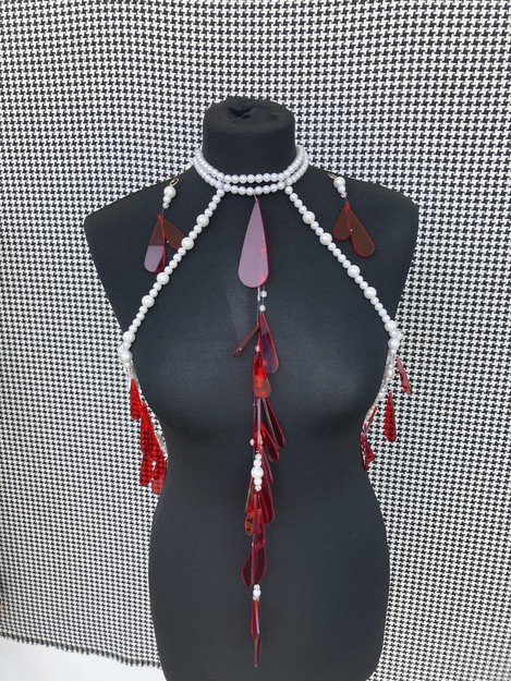 Navdih je našla v filmu Carrie. Osnovna tkanina je črna lycra, ki ji je Jana ob odprtinah na nogi dodala volneno rdečo prejo. Modni dodatek so še ogrlica in uhani, narejeni iz umetnih biserov in rdečega pleksi stekla v obliki rdečih kapljic. Osnovne barve so rdeča, črna in bela.