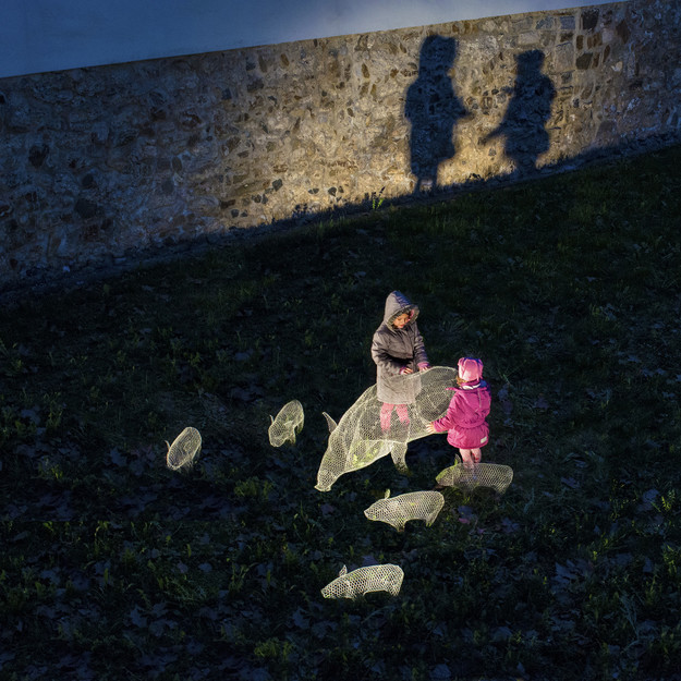 Ambientalna instalacija temelji na svetlobni igri z odsevi, ki plešejo po arhitekturi in jo spreminjajo v sanjsko podobo.