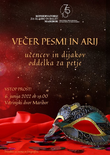 Učenci in dijaki oddelka za petje Konservatorija za glasbo in balet Maribor se nam tokrat na Večeru pesmi in arij predstavljajo z glasbeno pravljico, ki nas iz otroških sanj popelje v skrivnosten svet čudežnih bitij, kjer dobro premaguje zlo, kjer ljubezen premaga žalost in so na koncu vsi srečni. Naša glasbena pravljica je lepljenka oziroma pasticcio različnih opernih in operetnih arij in ansamblov iz različnih obdobij ter skladateljev od Mozarta, Rossinija, Offenbacha,