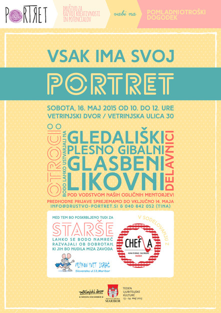 Za otroške delavnice so potrebne predhodne najave in sicer do četrtka, 14. maja na e-mail info@drustvo-portret.si ali preko telefona 040 642 052 (Tina).