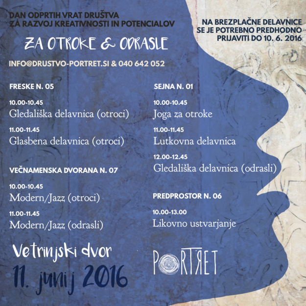 Društvo za razvoj kreativnosti in potencialov – Portret, socialno podjetje, v soboto 11.6., med 10. in 13. uro, odpira svoja vrata za otroke, mladino in odrasle in vabi, da se udeležite nekaterih delavnic, ki se izvajajo v Portretu skozi celo šolsko leto. Delavnice bodo brezplačne, nujna je le predhodna prijava na email: info@drustvo-portret.si ali telefonsko številko: 040 642 052 in sicer