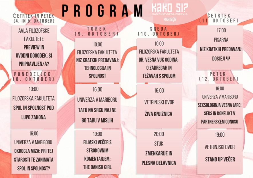 Dogodek je del projekta Kako si? Maribor, ki v tednu dneva duševnega zdravja ( med 5. in 12. oktobrom), ponuja vrsto brezplačnih delavnic, predavanj in drugih aktivnosti. Celoten program in informacije o ostalih dogodkih najdete tukaj