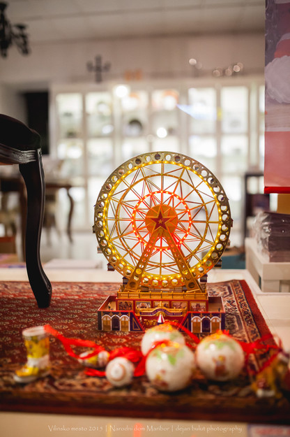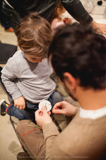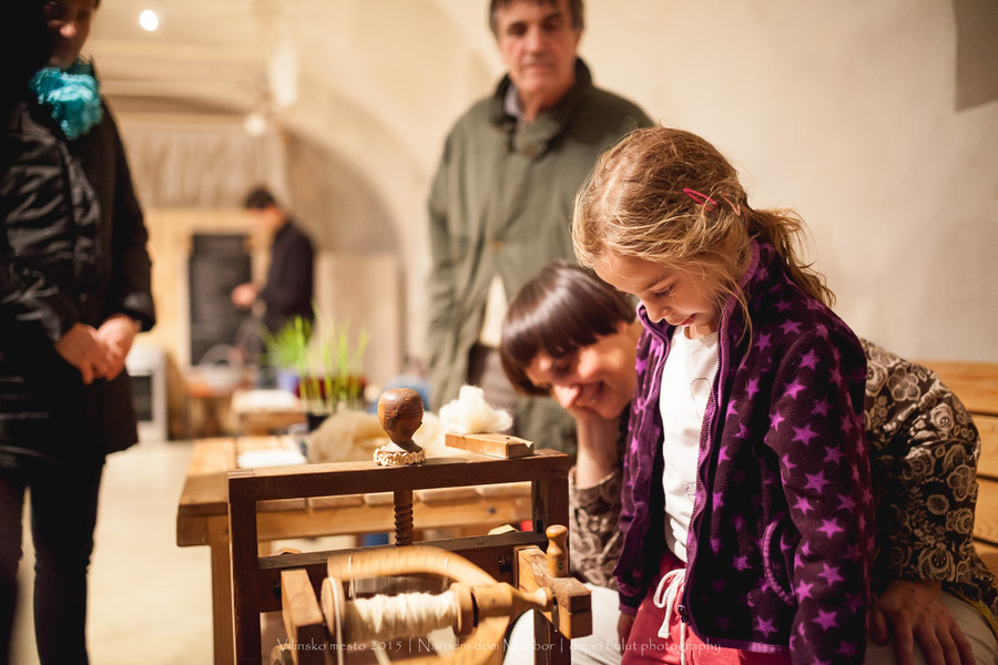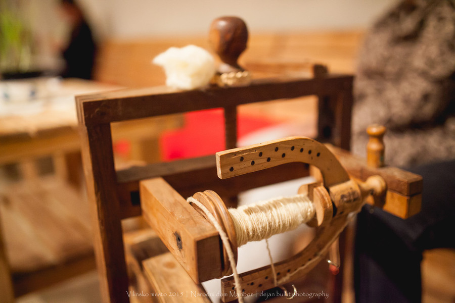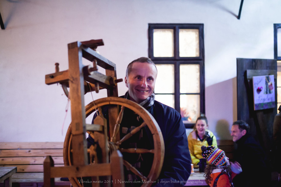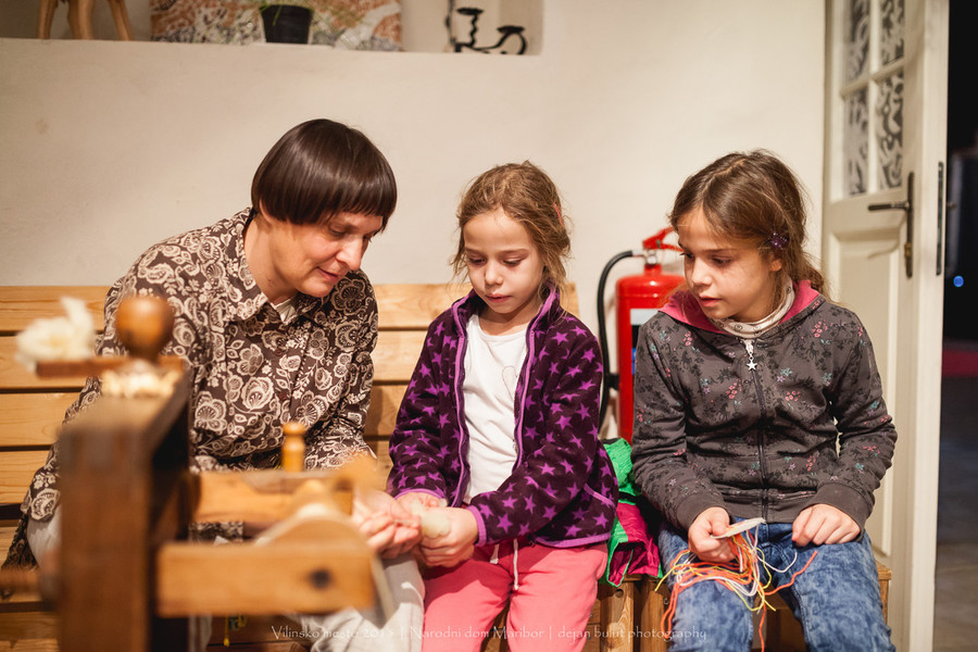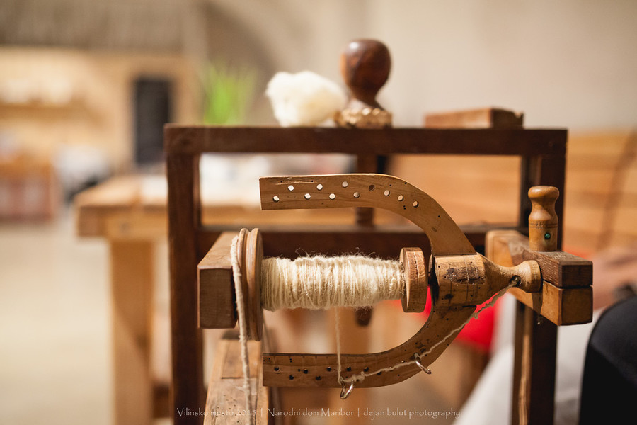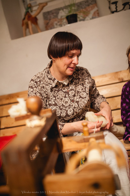 Prikaz predenja niti na kolovratu in delavnica pletenja trakov s ploščicami. Tako predejo in pletejo predice.